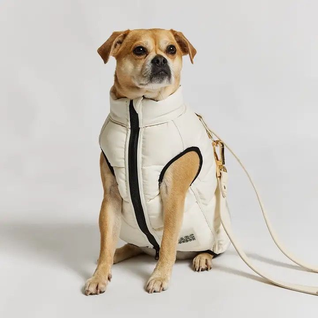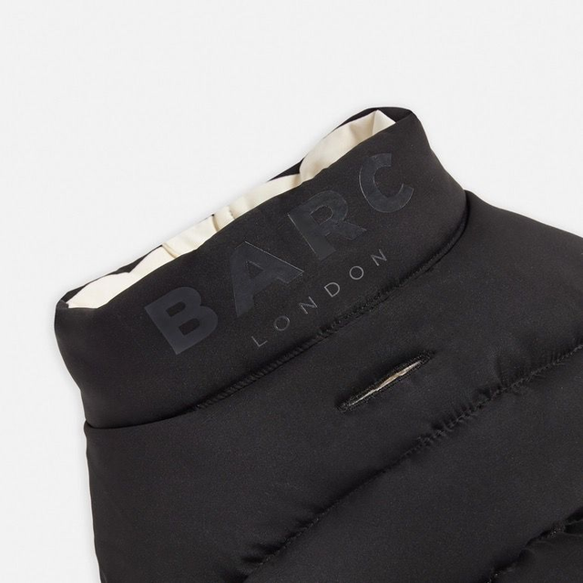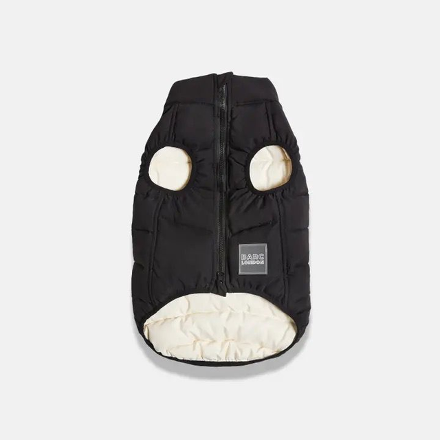 Barc London's fabulous Reversible Dog Puffer Jacket - the ultimate cold-weather essential for your fashionable pup! This cozy coat offers two stylish looks in one, with a black side and an off-white side featuring chic black accent details. Designed with recycled padding for warmth and environmental responsibility, this jacket is water and wind-resistant for added protection. The harness-friendly back opening and zip closure with protector make it easy to put on and take off. Available in seven sizes to ensure the perfect fit, this jacket is perfect for trendy pups who love versatility and staying warm on chilly days.