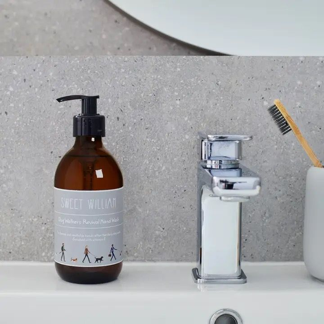 Treat the dog walker in your family to Sweet William's Dog Walkers Revival hand wash. Enriched with vitamin E, this hand wash cleanses and revitalizes hands after daily walks. The charming amber glass container showcases a row of dog walkers and their furry companions, making it a perfect addition to any bathroom or utility room. This vegan, cruelty-free formula is paraben and SLS free, ensuring a gentle cleansing experience. Pair it with the matching hand lotion for a complete pampering session. Made in England, this 300ml bottle is a thoughtful gift for any dog lover.